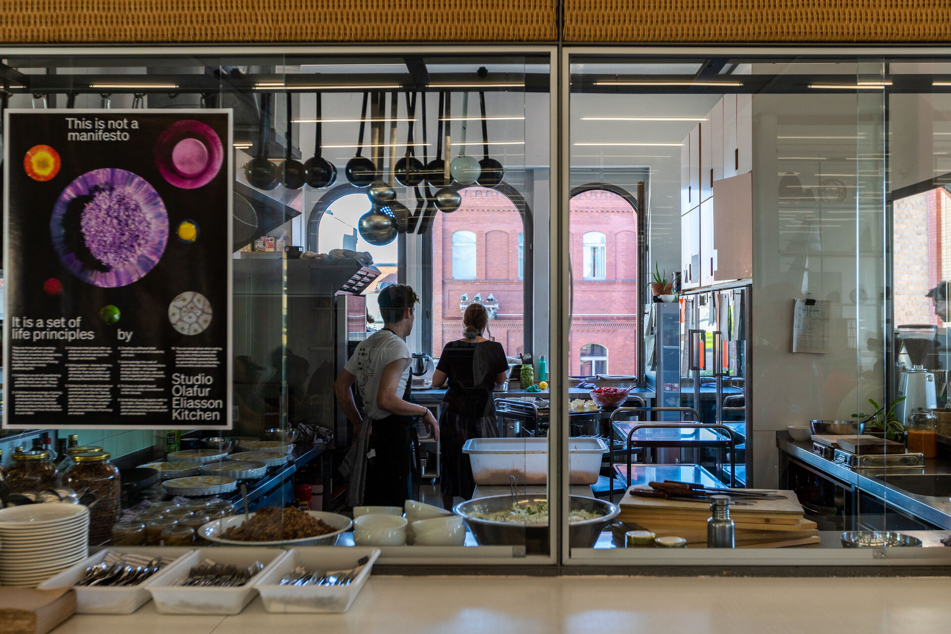 The team at Studio Olafur Eliasson consists of craftspeople and specialized technicians, architects, archivists and art historians, web and graphic designers, film-makers, cooks, and administrators. They work with Eliasson to develop, produce, and install artworks, projects, and exhibitions, as well as on experimentation, archiving, research, publishing, and communications. In addition to realizing artworks in-house, Eliasson and the studio work with structural engineers and other specialists and collaborate worldwide with cultural practitioners, policymakers, and scientists. The studio hosts workshops and events in order to further artistic and intellectual exchanges with people and institutions outside the art world.